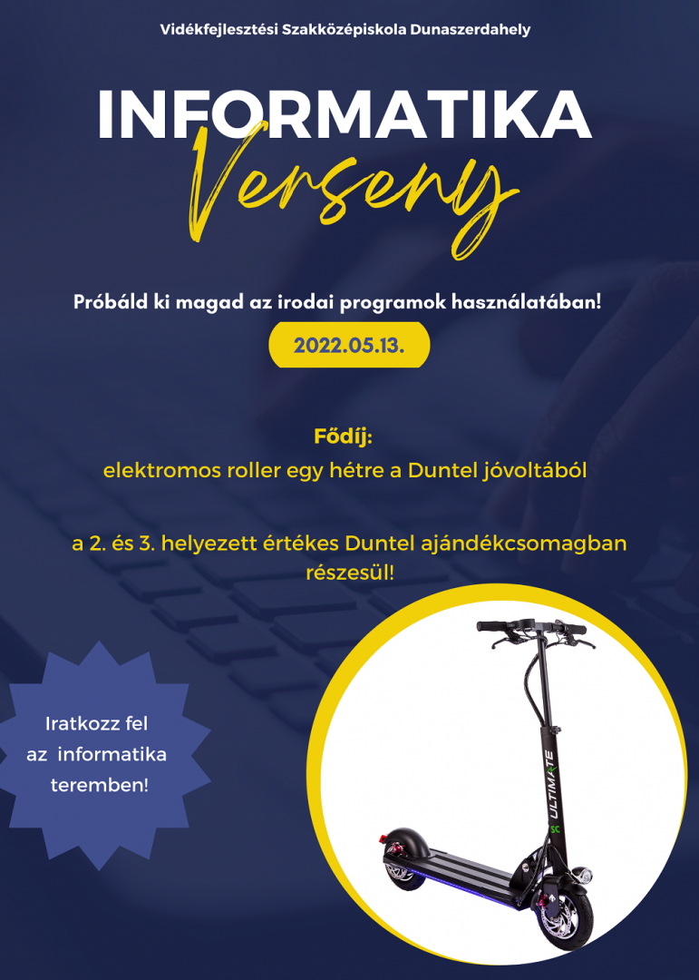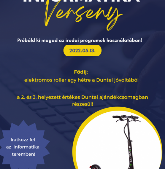 2022. május 13-án tartottuk meg az informatika verseny iskolai fordulóját. A versenybe 24 tanuló kapcsolódott be. Az 1. és 2. évfolyam tanulóinak Microsoft Word feladatokkal kellett megbirkózniuk, míg a harmadikosok és negyedikesek kreatív hirdető plakát megszerkesztésében próbálhatták ki magukat. A diákok ügyesen végrehajtották a feladatokat, és rendkívül ötletes marketing anyagok születtek. A legügyesebbek a Duntel jóvoltából értékes ajándékokban részesültek. A fődíj egy elektromos roller volt, ami egy teljes hétre a nyertes rendelkezésére áll. A 2. és 3. helyezettek pedig értékes Duntel ajándékcsomagot tudhatnak magukénak. Ezúton is köszönjük a nagylelkű felajánlásokat!