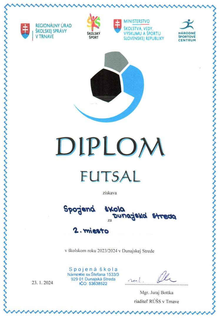 2024.01.23-án a dunaszerdahelyi városi sportcsarnokban került megrendezésre 9 iskola részvételével a járási futsal bajnokság, amelyen iskolánk csapata nagyon szépen szerepelt, a 2. helyen végzett. Csupán a 6 szlovák válogatott labdarúgóval felálló Dúbrava gimnáziumtól szenvedtek vereséget, egy izgalmas, nagyon szoros mérkőzésen. Eredményükhöz gratulálunk!
