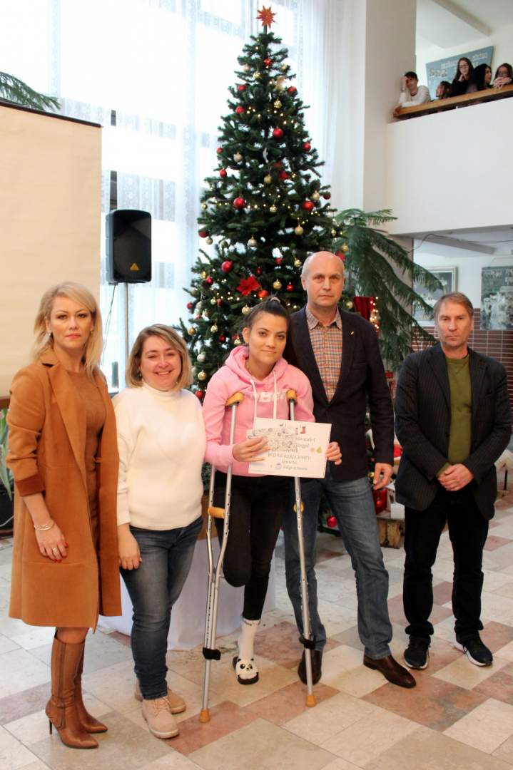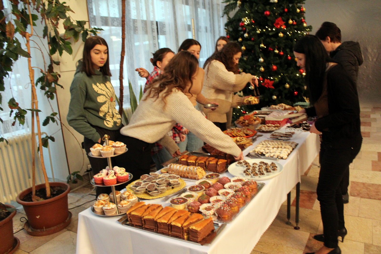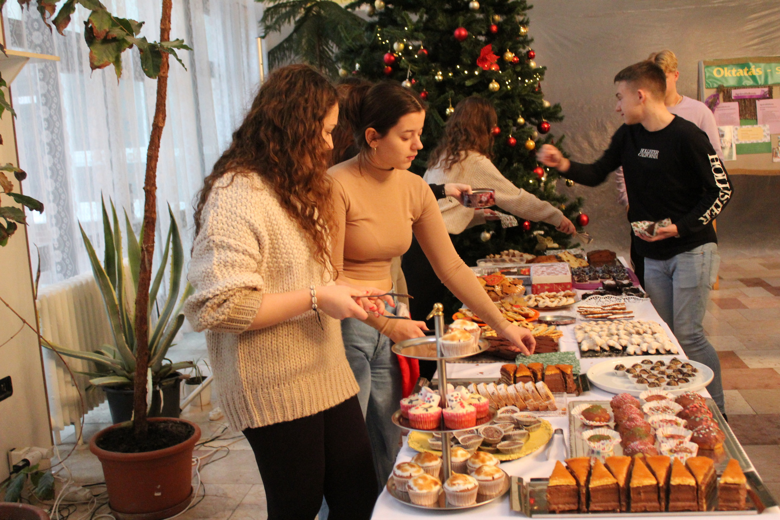 Iskolánk adventi rendezvényei közül a jótékonysági sütivásár volt méltán a legnépszerűbb. 2022. december 21-én fahéj-, vanília-, narancsillat lengte be az intézmény auláját. A diákok kora reggel otthon sütött karácsonyi finomságokkal teli dobozokkal érkeztek. A karácsonyfa árnyékában megterített asztalokra számos dobos torta, bejgli, mézeskalács, hókifli, brownie, muffin, fonott kalács, zserbó, linzer és még sok más, az iskolában tanított nyelvekhez kapcsolódó nyalánkság került. Az érdeklődők a szünetekben kígyózó sorokban várták, hogy megkóstolhassák az ínycsiklandó édességeket. Sorban állás közben pedig megtekinthették a nemzetközi karácsonyi standokat, amelyek az egyes nyelvterületek – angol, német, szlovák, magyar- ünnepi szokásait mutatták be. A vásári portékáknak nagyon nagy keletje volt, a tanítás végére kiürültek a tálcák, szinte minden elfogyott. Az eladásból befolyt összeget az iskola egykori sportosztályos, majd idegenforgalmi tanulmányi szakon tanuló diákjának, Takács Brigittának ajánlottuk fel, aki egyik napról a másikra került súlyos egészségügyi állapotba. Briginek sikerült részt vennie testvére kíséretében a suli karácsonyváró gáláján, így személyesen vehette át az adományt, megköszönve azt, hogy gondoltak rá, és hozzájárulnak a gyógykezeléshez.
