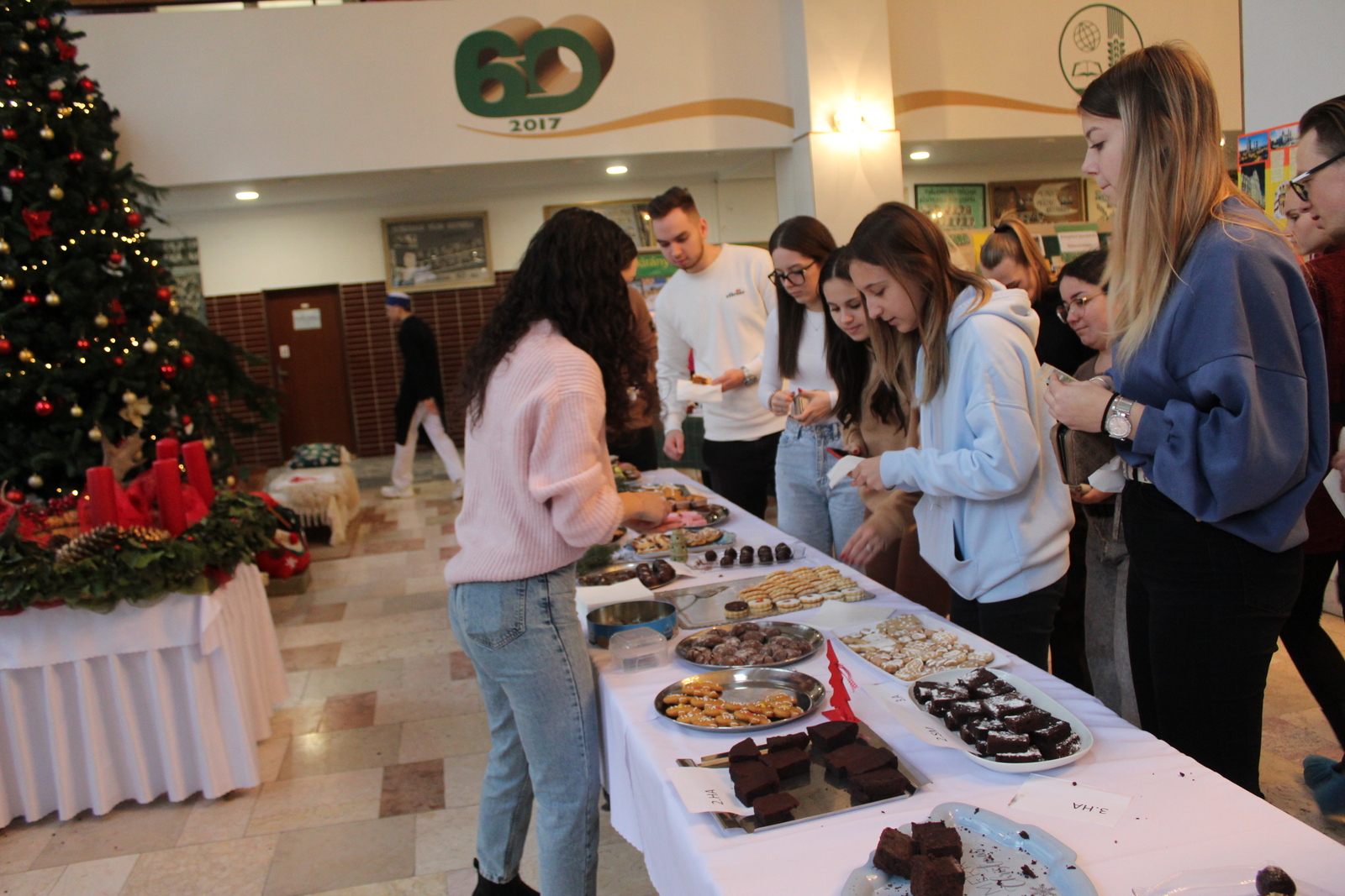 Iskolánk diákjai mindig nagy lelkesedéssel vesznek részt a különböző karitatív tevékenységekben. Tavaly indítottunk útjára egy új, jótékonysági rendezvényt, a karácsonyi sütivásárt. Már akkor kiderült, hogy a következő kalendáriumi év utolsó tanítási hétében is újra nekifogunk és sütünk, asztalt terítünk, árusítunk, de legfőképp adományozni fogunk. Így idén is fahéj-, vanília- és dióillat lengte be az aula légterét. Minden osztály szorgosan készült, finomabbnál finomabb, ráadásul szebbnél szebb sütemények kerültek az asztalokra. Zserbó, brownie, muffin, linzer, rákóczi túrós, mézeskalács, fahéjas csiga, Sacher-torta és csokis keksz közül választhattak a diákok és a tanárok. A finomságoktól roskadozó asztalok mellett nemzeti (magyar, szlovák, angol, német) karácsonyi szokásokat bemutató tárgyakat, képeket tekinthettek meg az alkalmi vásárlók. A rendezvény a vártnál is népszerűbb lett, szinte percek alatt elfogytak az édességek. Az összegyűlt összeget ezúttal a Mentális Sérülteket Segítő Társaságnak ajánlottuk fel. Az adományt Lanstyák Edit, a társaság egyik koordinátorának a karácsonyi évzáró gálán adtuk át.