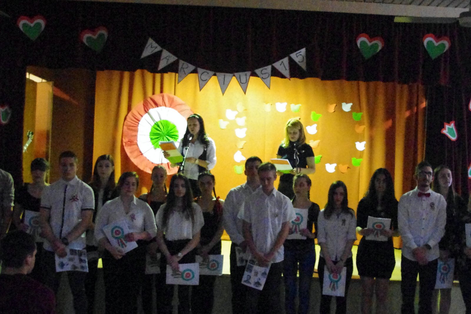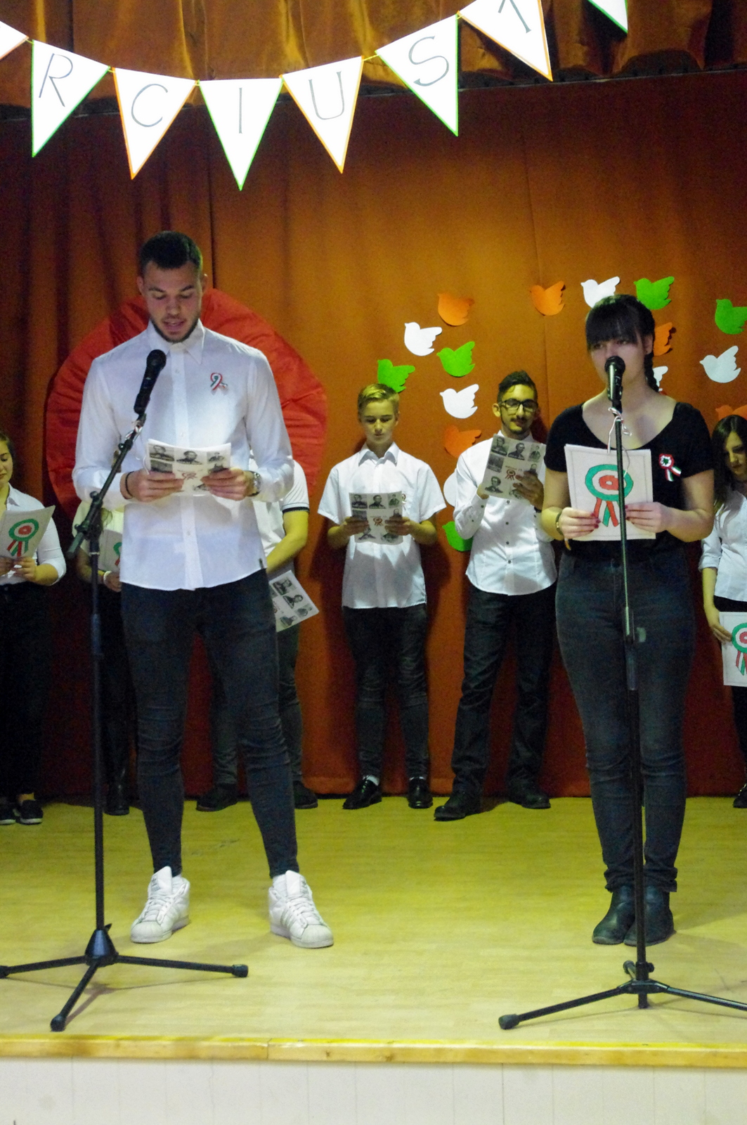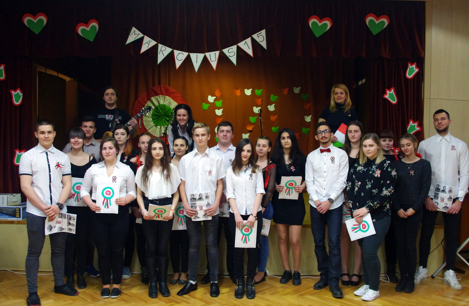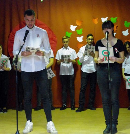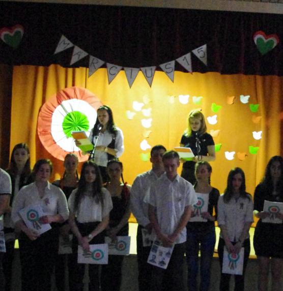 Szabadság, szerelem címmel zenés-irodalmi műsort tartottak iskolánk diákjai március 15-én.A márciusi forradalom 170. évfordulójának tiszteletére  összeállított programban azokról a fogalmakról emlékeztek meg dalban és versben, amelyek mára már szinte összeforrtak  legnagyobb nemzeti ünnepünkkel. Szó volt a 12 pontról, a Pilvax Kávéházról, a Nemzeti Múzeumról és természetesen a Nemzeti dalról is. A forradalmárok mellett azokról is szóltak, akik 1848 főszereplőit a háttérből támogatták, akik olykor maguk is fegyvert ragadtak, sebesülteket ápoltak, menekülteket bújtattak vagy éppen csak csendesen szeretteikért aggódtak. Ők voltak a márciusi ifjak szerelmei, lánytestvérei, többek közt Szendrey Júlia, Laborfalvi Róza, Damjanichné Csernovics Emília, ill. Kossuth Zsuzsa és Teleki Blanka.Bár a forradalom mozzanatait a diákság úgy ismeri már, mint a bibliai történeteket, Nyáry Krisztián frissen megjelent Fölébredett a föld című könyvéből és annak promóciós videóiból sikerült olyan újdonságokat bemutatni, amelyek eddig még nem voltak ismeretesek.Az ünnepi műsort az iskola tehetséges énekesei és zenészei a legismertebb forradalmi dalok előadásával, tánccsoportja pedig piros-fehér-zöld koreográfiájával tette még emelkedettebbé. A megemlékezés videóanyagát egyrészt a Red Bull Pilvaker projekt tavalyi előadásának részletei, másrészt pedig felvidéki előadóművészek (Vadkerti Imre, Ghymes, Szvorák Katalin) produkciói képezték. A felkészítő tanárok, Nagy Zsuzsanna és Kis Lívia szabadságköszöntő gondolataival és a Himnusz eléneklésével zárult az idei ünnepi rendezvény.