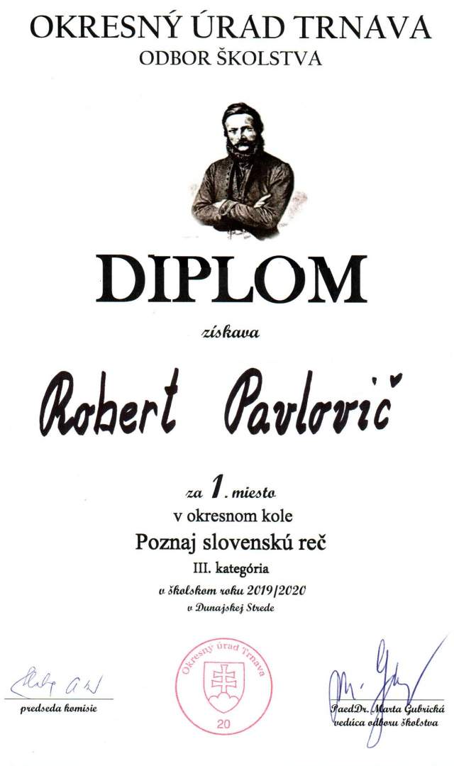 Do krajského kola postupuje na 1.mieste Róbert Pavlovič.