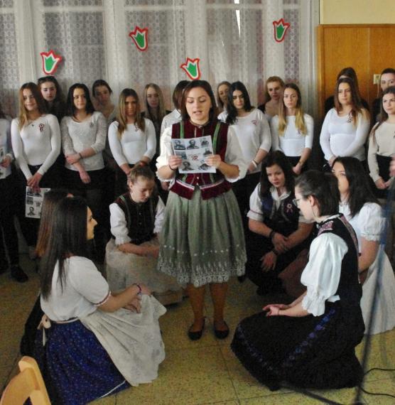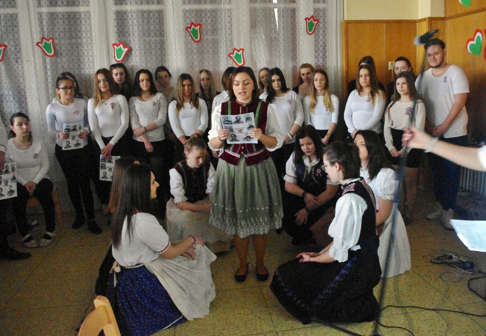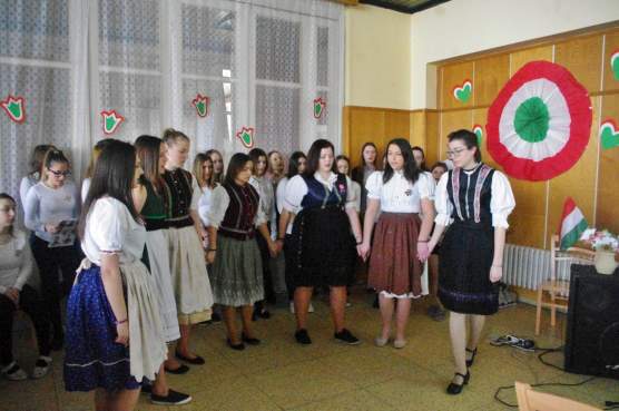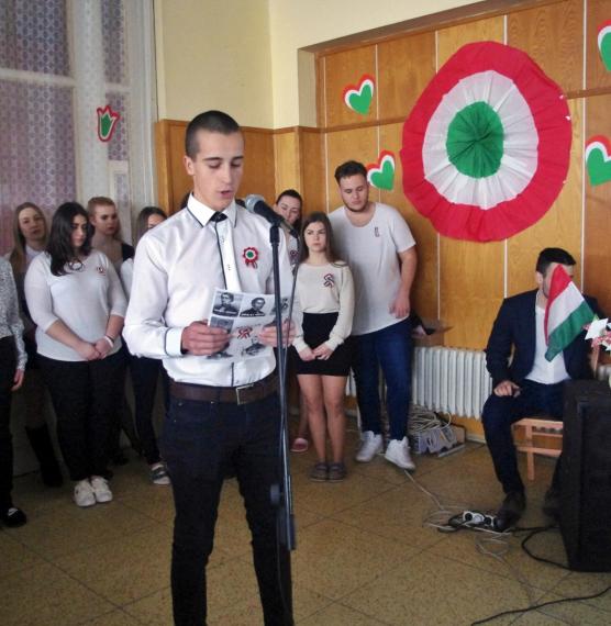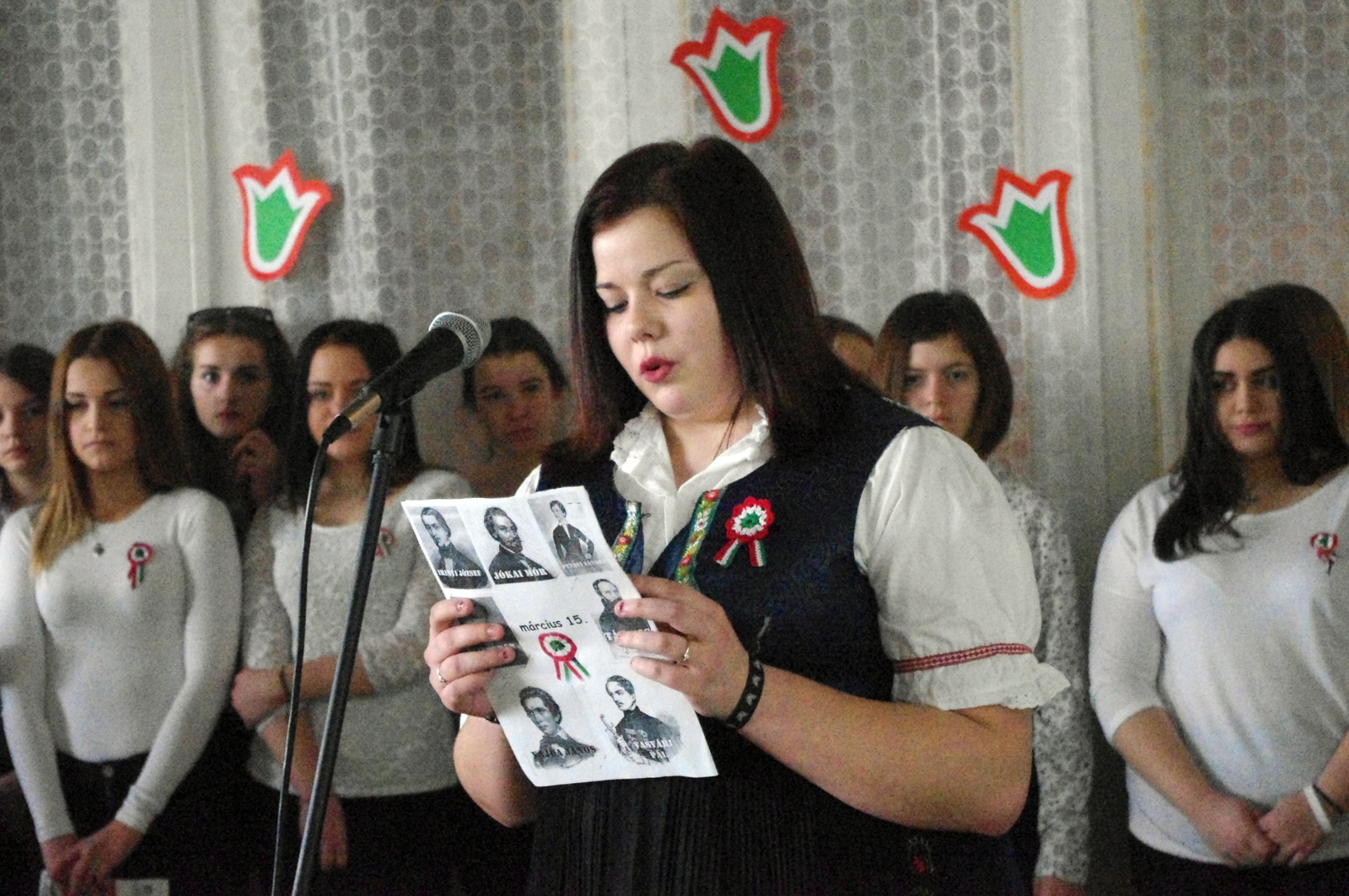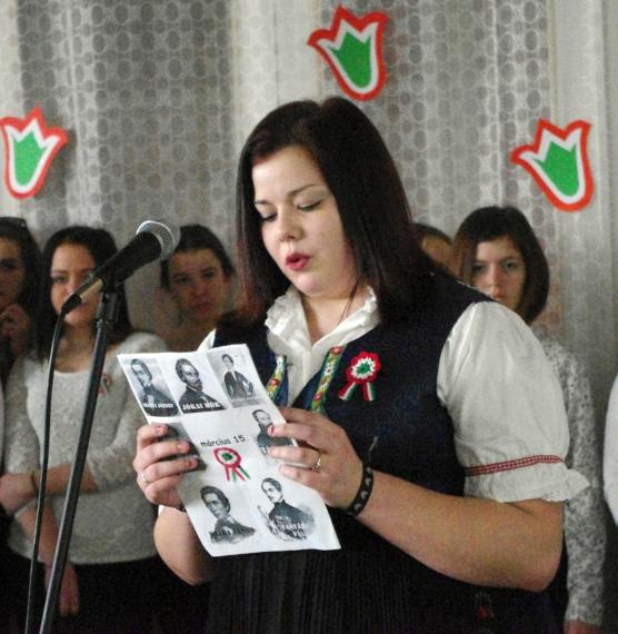 A Petőfi, Vasvári, Irinyi, Vajda, Jókai, Táncsics és Landerer történelmi jelentőségét bizonyító sorokon kívül elhangzottak továbbá a naphoz fűződő versrészletek is, az alkalmi diákkórus tolmácsolásában pedig felcsendült a híres Kossuth-nóta, a Talpra magyar népzenei változata ill. a Tavaszi szél vizet áraszt című dal is, néptánc kíséretben.