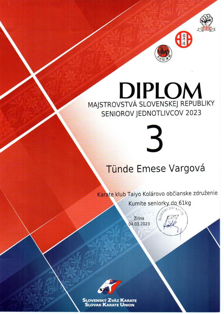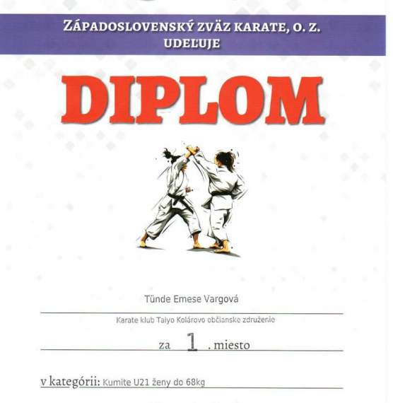 2023.02.12-én Érsekújvárban (Nové Zámky) került megrendezésre a nyugat-szlovákiai kupa karatéban, ahol a III.SM diákja, Varga Tünde Emese remekelt, hiszen a dobogó legfelső fokára állhatott, majd 2023. március 4- én a Zsolnán (Žilina) zajló kumite karate felnőtt országos döntőjében a nagyon szép 3. helyen végzett. Eredményéhez gratulálunk!