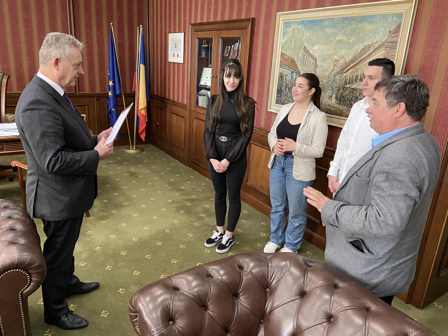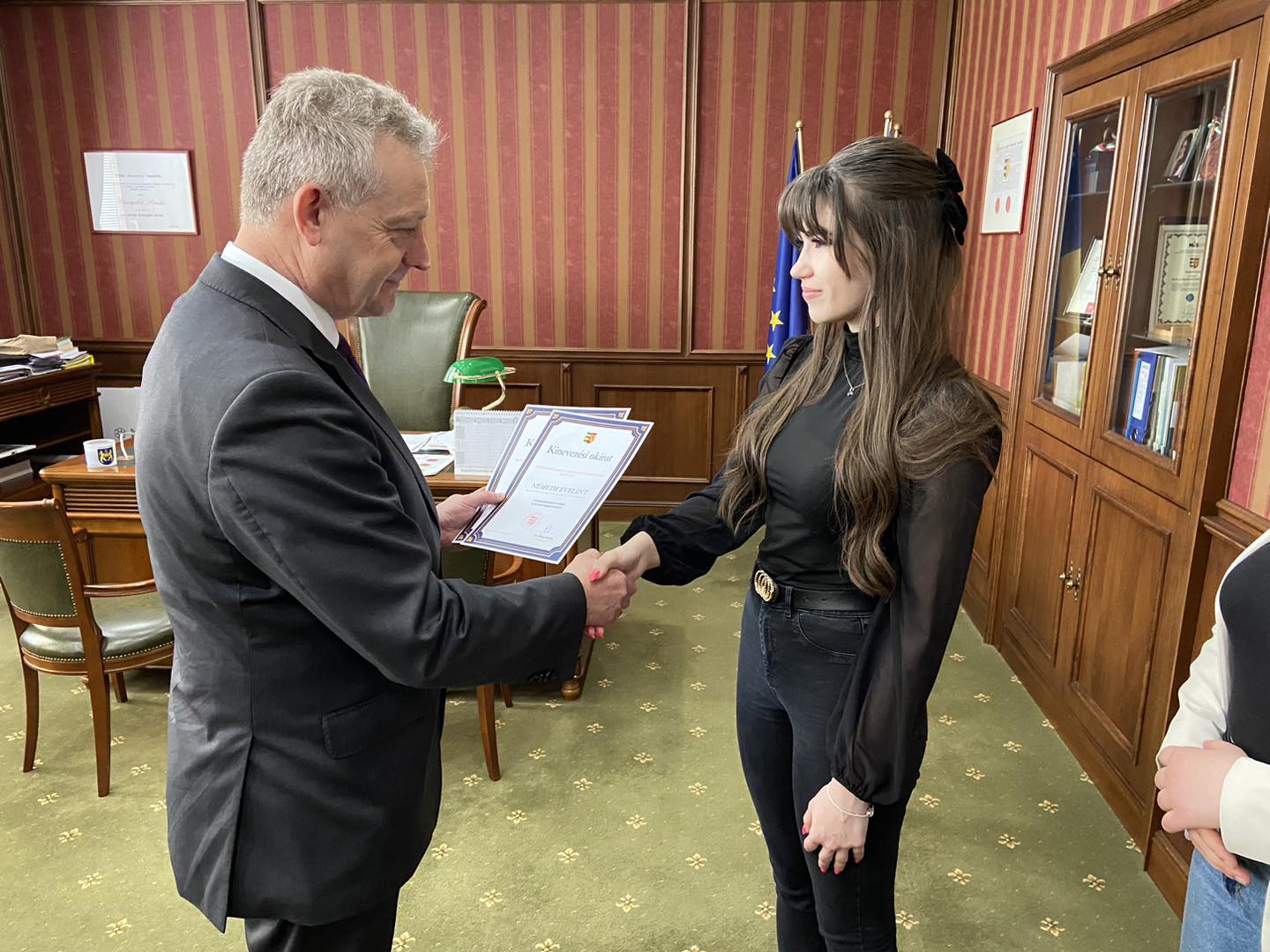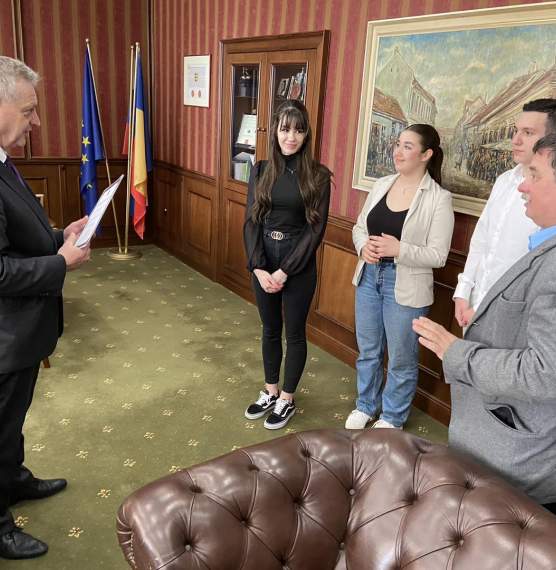 Dr. Hájos Zoltán, városunk polgármestere ma hivatalában fogadta Németh Evelint, a Szent István téri Közös Igazgatású Középiskola diákját, akit a városi ifjúsági parlament tegnap választott meg diákpolgármesternek, valamint a diákpolgármester-választás további két jelöltjét, Dziadek Tamást, a Kodály Zoltán Alapiskola, és Tóth Kamillát, a Neratovicei téri Magán Szakközépiskola diákjait, akik a jövőben alpolgármesterekként segítik majd Németh Evelin munkáját. Városunk polgármestere hivatalosan is beiktatta a diákpolgármestert, valamint az alpolgármestereket, majd eszmecserét folytattak a fiatalok elképzeléseiről és a jövőbeli lehetőségeikről.