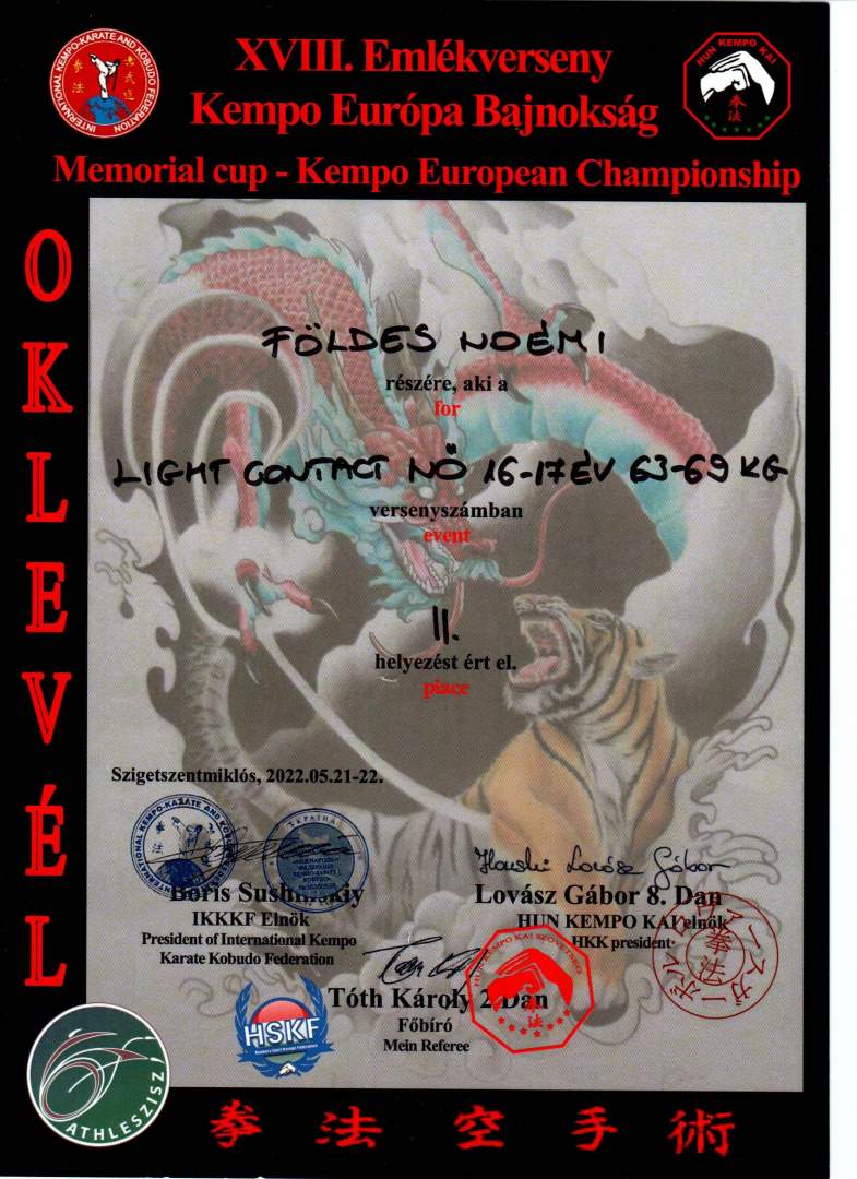 2022. 05. 21-én Szigetszentmiklóson került megrendezésre a Kempo Európa Bajnokság, amelyen az 1.SM diákja Földes Noémi nagyon szépen szerepelt, hiszen a Light Contact Nő 16-17 évesek 63-69 kg-os kategóriájában a 2. helyen végzett. Az eredményhez gratulálunk!