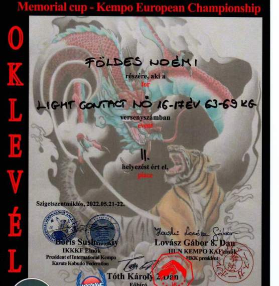 2022. 05. 21-én  Szigetszentmiklóson került megrendezésre a Kempo Európa Bajnokság, amelyen  az  1.SM diákja Földes Noémi nagyon szépen szerepelt, hiszen a Light Contact Nő 16-17 évesek  63-69 kg-os kategóriájában a 2. helyen  végzett. Az eredményhez gratulálunk!